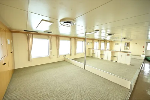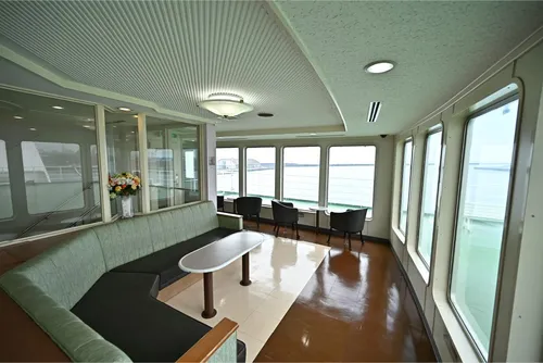 The middle size car ferry with capacity of 584 passengers and 150 vehicles. Kogane Maru navigates between Naoetsu Port and Ogi port daily except winter season. From 3rd to 5th floor of this ship is for passenger compartments, with cabins, observation lounge, pet corner, and photography spot. 1st and 2nd decks are designated for vehicle storage. The passenger cabins vary in type, second class with carpeted floor, first class with carpeted floor, first class with dog room, and Special Room.