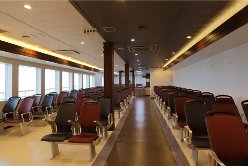 This Car Ferry is very large, with capacity of 1,461 passengers and 168 vehicles. Tokiwa Maru navigates between Niigata Port and Ryotsu port daily. From 3rd to 5th floor of this luxury ferry is for passenger compartments, with cabins, event plaza, observation lounge, pet corner, kids room and nursing room. 1st and 2nd decks are designated for vehicle storage. The passenger cabins vary in type, second class with carpeted floor, first class with choice of carpeted floor space, chairs and convenient chairs, Special Room, and Suite Room.